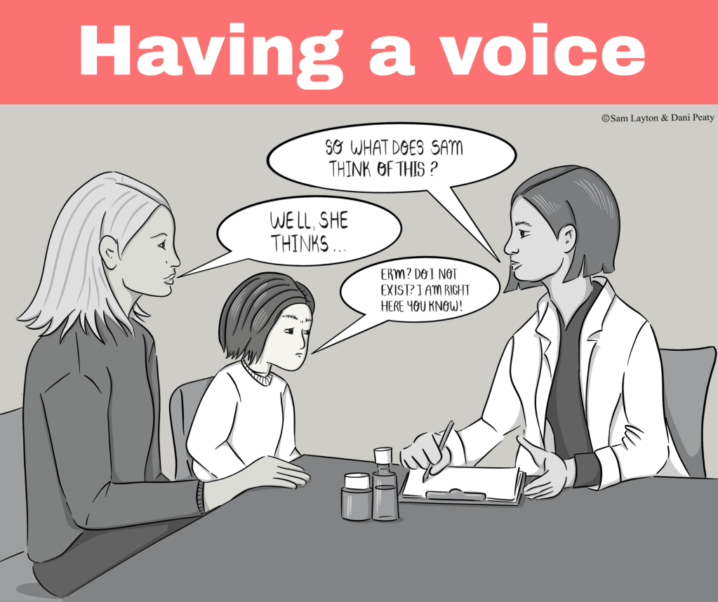 The issue is, even if services are able to be accessed confidentially, ensuring the young person has a voice is still key. There will be many young people who want their parent present but it is important to ensure that the young person is spoken to within the appointments and given the chance to speak in private, incase there is anything they wish to bring up privately. Both as a young person and an adult, in tens of appointments with a parent present where sensitive questions have arisen, whether it’s been about my mental health, if I’m pregnant or if I’m on any medications, I have never been asked if I want to speak privately.